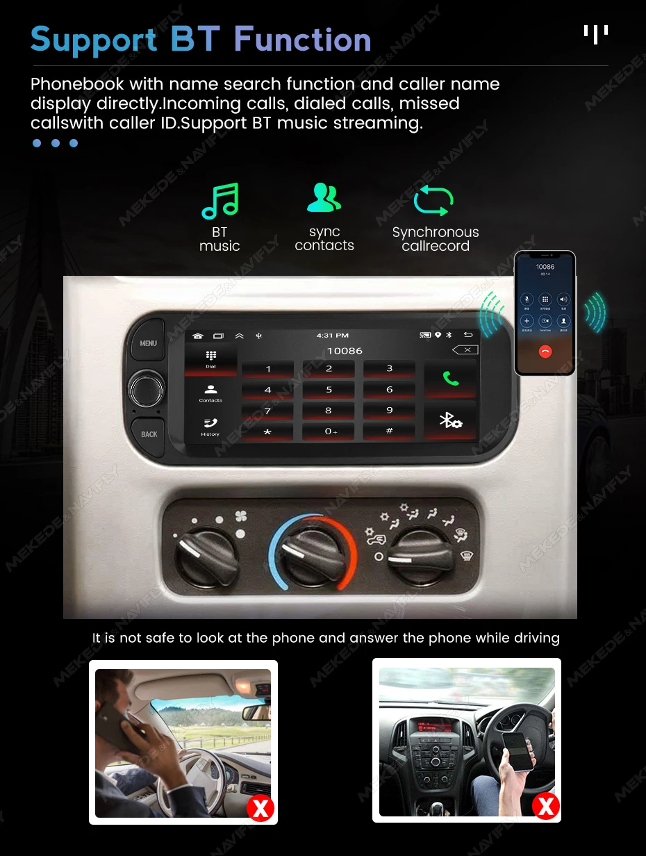 Built in intelligent BT system, supports mobile BT pairing, hands-free dialing, supports steering wheel buttons for street listening, chat with others, ensuring your driving safetysupport Steering Wheel Control